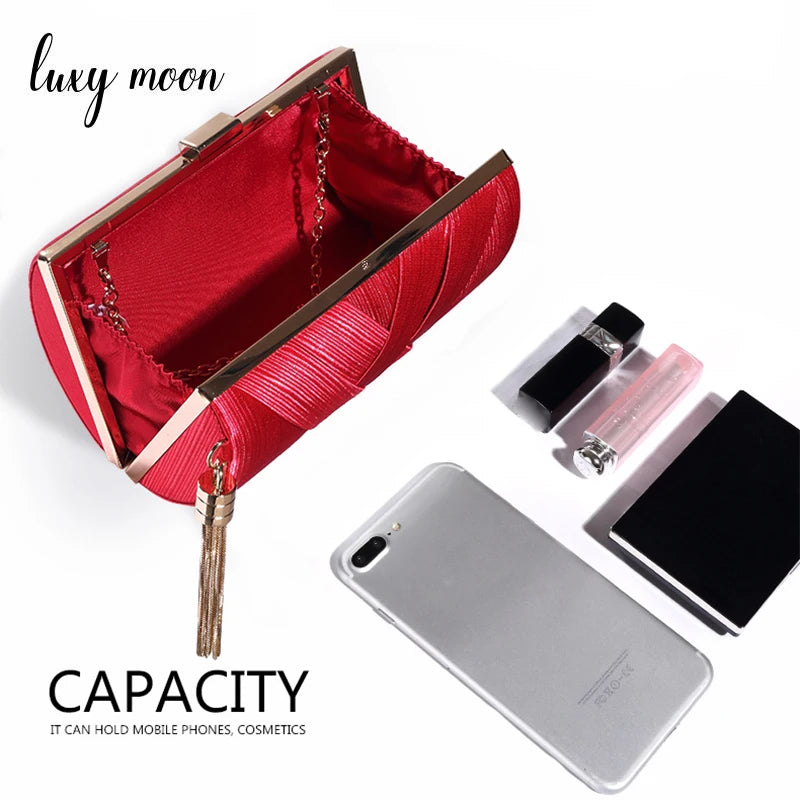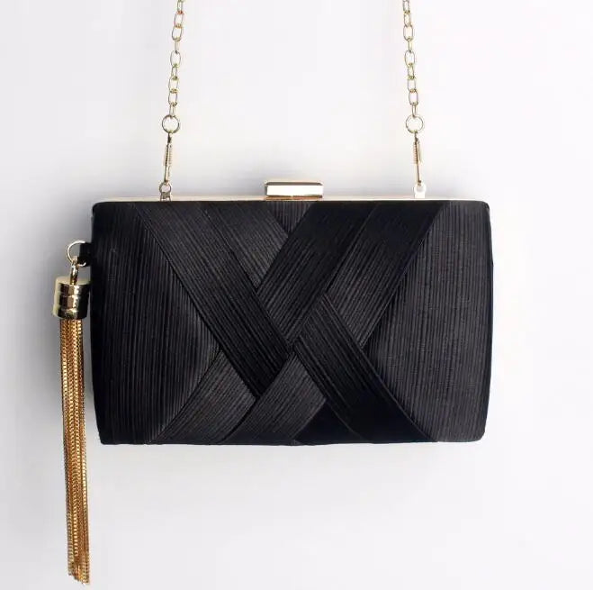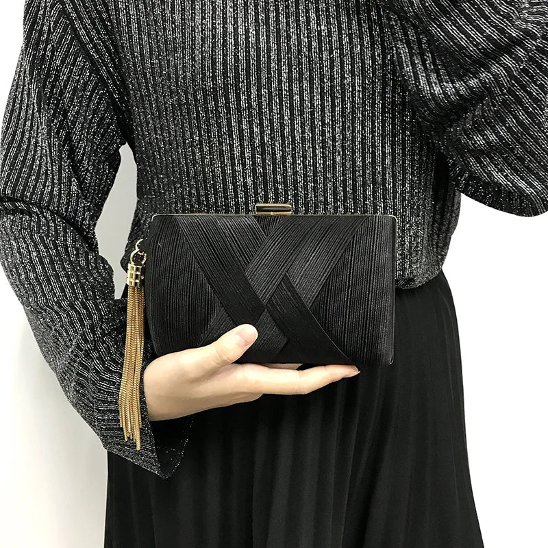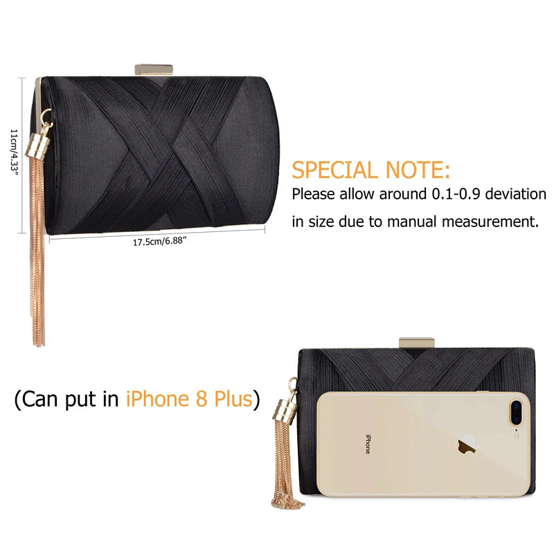 The Morgan clutch by Luxy Moon expertly blends classical design with contemporary flair, making it perfect for both day and evening occasions. Crafted from durable polyester with a hardness that retains its elegant shape, this minaudiere features a secure hasp closure and a metal tassel accent for added sophistication. Its criss-cross decoration and polished finish available in black, gold, silver, blue, green, pink, purple, and champagne enhance its fashion-forward appeal. Inside, a dedicated cell phone pocket offers organized convenience, while the included chain shoulder strap provides versatile carrying options. Measuring 17 x 7 x 10 cm, the Morgan is an ideal accessory for parties and refined events.
